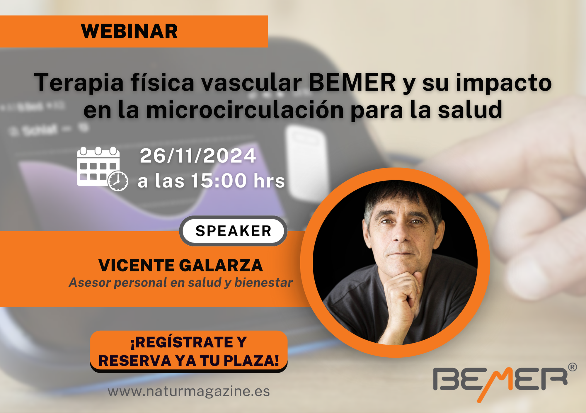 En este webinar, Vicente Galarza, asesor personal en salud y bienestar, nos guiará en un fascinante recorrido por la terapia físico vascular BEMER. Vicente nos explicará cómo BEMER actúa sobre funciones esenciales del cuerpo, sin recurrir a productos químicos ni promesas de “curas milagrosas”. En lugar de magia, la terapia se basa en principios físicos y utiliza un campo magnético pulsado para mejorar la microcirculación, lo que a su vez optimiza el suministro de nutrientes y oxígeno a nuestras células, y facilita la eliminación de desechos metabólicos.